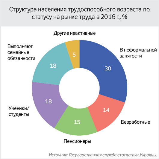 От политиков и некоторых экспертов часто приходится слышать, что среди населения трудоспособного возраста около половины не платят взносы, и это резерв для решения финансовых проблем страховой системы. Но если рассмотреть структуру населения трудоспособного возраста по статусу на рынке труда, то подавляющее большинство этих людей имеют достаточно уважительные причины не работать и/или не платить взносы (см. рис.). Среди незанятого населения (всего 8,7 млн человек) 1,7 млн человек составляют безработные, почти 2 млн уже являются пенсионерами, еще 4,5 млн человек - ученики/студенты и лица, выполняющие семейные/домашние обязанности. Среди населения в неформальной занятости (всего 3,7 млн человек) почти 1,5 млн человек - это лица, работающие в личных крестьянских хозяйствах с частичной продажей произведенной продукции, и для них участие в страховой системе не обязательно. То есть в действительности в стране нет значительного ресурса для "мобилизации" дополнительных плательщиков взносов, не говоря уж о 7 млн человек. Даже в случае улучшения ситуации с занятостью, учитывая демографические тренды, существенного прироста количества плательщиков ЕСВ ожидать не приходится.