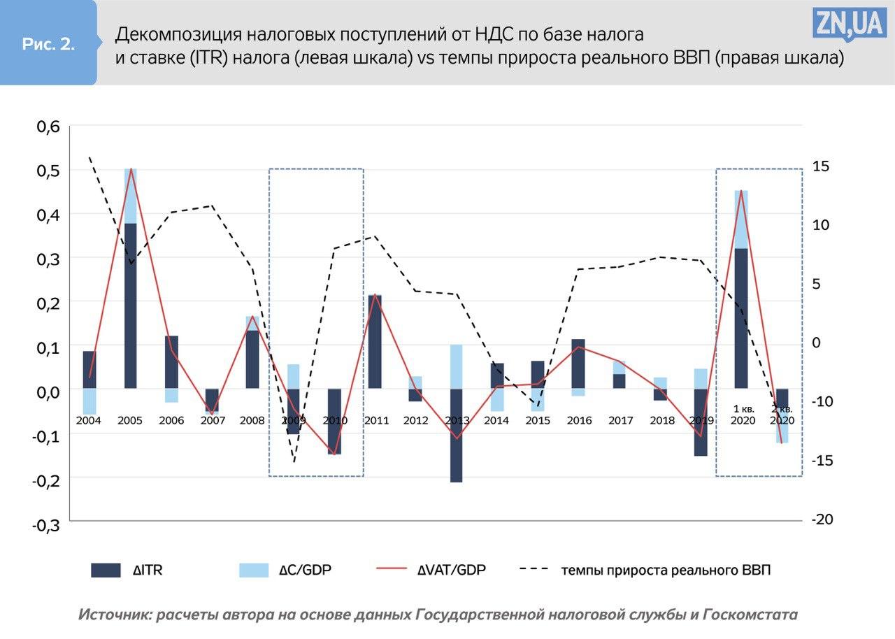 В-третьих, несмотря на теорию, практика говорит нам о том, что конечное потребление как элемент ВВП и вместе с тем база одного из основных налогов достаточно непостоянно. Оно с определенным лагом, зависящим от обстоятельств места и времени, движется в унисон с общей макроэкономической динамикой. И это действительно характерно не только для Украины, но и для стран ОЭСР, где исследователи отмечают, что фактические показатели налоговых поступлений от уплаты НДС часто бывают даже более волатильными, чем тот же ВВП или конечное потребление. Поэтому падение доходов от уплаты НДС — это только вопрос времени.