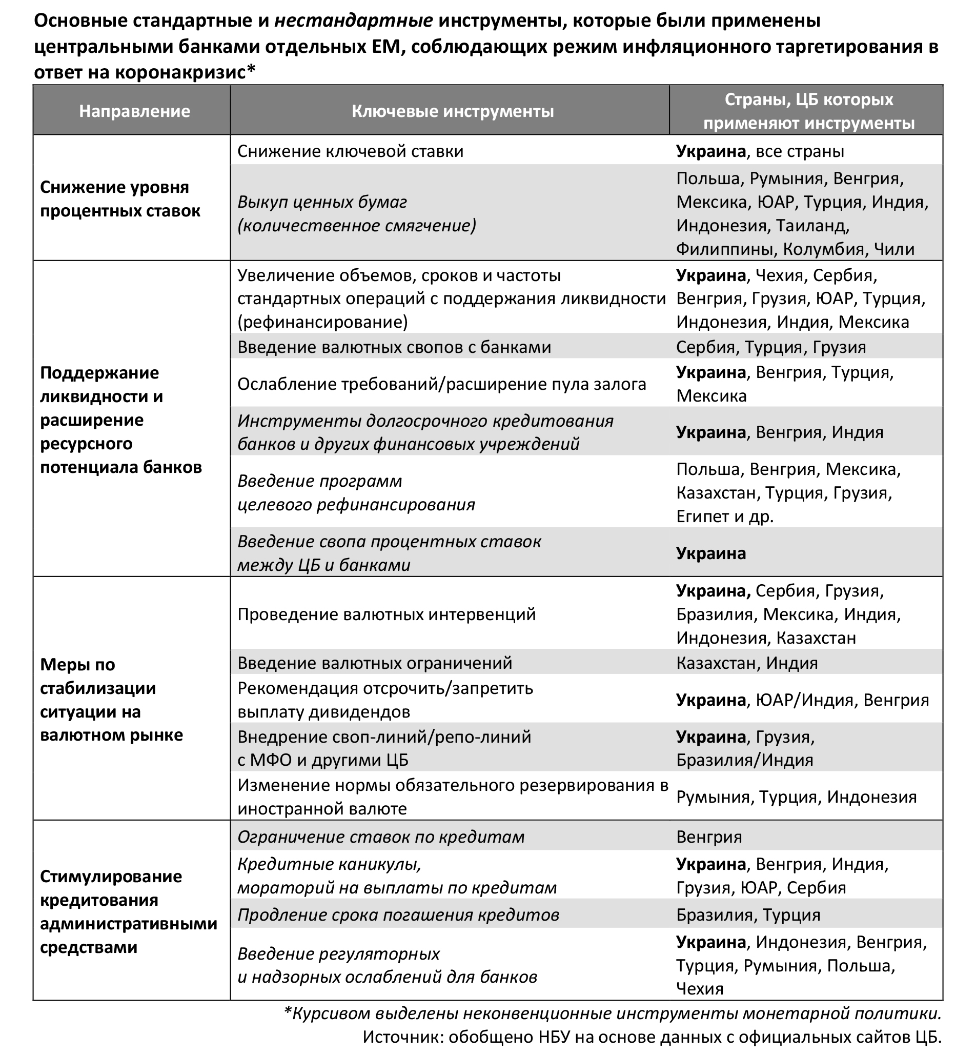 Вместе с тем подавляющее большинство центральных банков ЕМ также проявили много креатива и ввели ряд новых нестандартных монетарных инструментов для усиления действия традиционного инструментария (см. табл.).