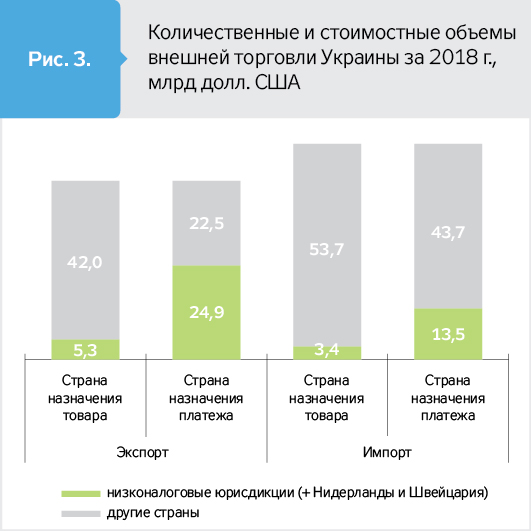 Более того, за 2018 г. в страны, входящие в определенный Кабинетом министров перечень низконалоговых юрисдикций, а также в Нидерланды и Швейцарию, где действуют льготные системы налогообложения компаний, не ведущих активную деятельность на территории этих стран, по данным НБУ, из Украины были отгружены товары на сумму 5,3 млрд долл. (11,2% от общего экспорта). В то же время объем экспортной выручки, поступившей в Украину из этих стран, составил почти 25 млрд долл. (52,6% от общего экспорта). Разница - почти 20 млрд долл. Аналогичная ситуация с импортными операциями, - разница между объемами операций по физическому импорту и платежами за импорт по низконалоговым юрисдикциям за 2018 г. составила свыше 10 млрд долл. (см. рис. 3).