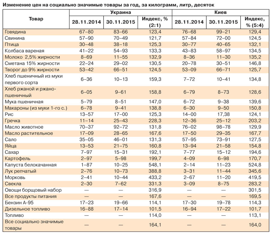 Рост цен за год впечатляющ. В целом по Украине по 23 продуктам питания цены на социально значимые товары выросли на 67%, особенно взлетели по "борщовому набору": по капусте - в 5,5 раза, моркови - 4,3, луку - 3,9, свекле - 3,3, картофелю - в 2,0 раза. Чуть-чуть ниже рост цен с учетом бензина и дизельного топлива. Примерно такие же пропорции и по Киеву. А октябрьская зарплата наемного персонала (ноябрьских данных еще нет) увеличилась на 29% по сравнению с октябрем 2014-го. Но при этом численность занятых по найму за этот период сократилась с 8,69 млн чел. до 7,96 млн, и увеличилась безработица.