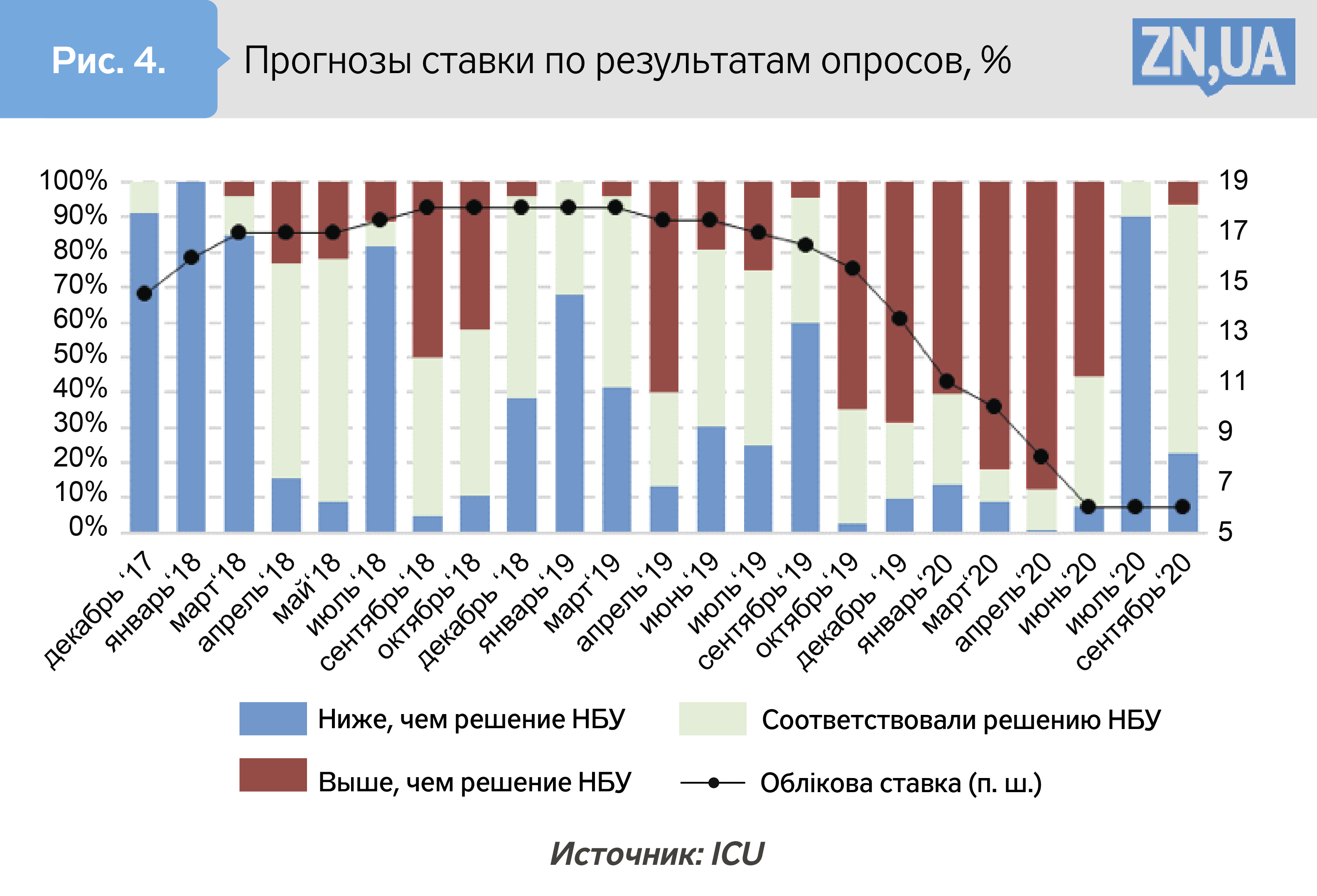 Во-вторых, ожидания по поводу ставки не демонстрируют симметрию в разрезе направлений решений. Так, с конца 2017 года экономические агенты не были склонны ожидать более решительного повышения ставки в ответ на усиление инфляционных процессов в 2017-м. Значительная доля опрошенных не была уверена в готовности к длительному поддержанию ставки на уровне 18% и в течение относительно продолжительного времени. Вместе с тем снижение ставки с марта 2019-го вплоть до июля 2020-го было, скорее, неожиданным. И чем быстрее НБУ смягчал политику в ответ на коронакризис, тем в большей мере это не вписывалось в ожидания.