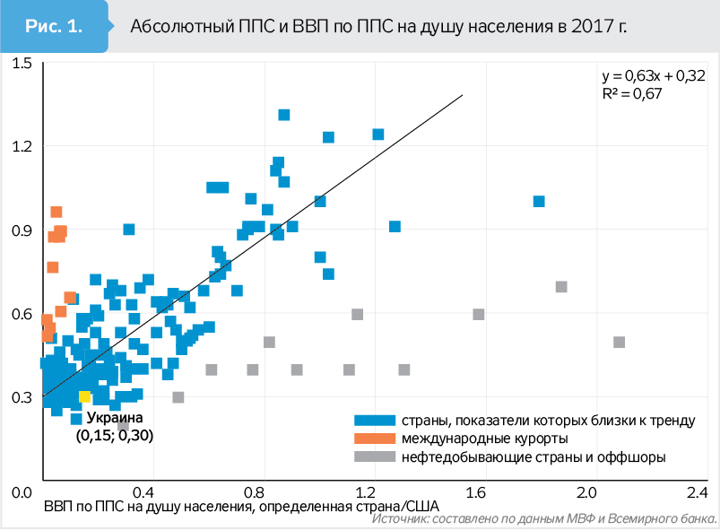 На рис. 1 отображено влияние одного из показателей производительности труда - ВВП по ППС на душу населения - на отклонение от ППС в 157 странах мира в 2017 г.