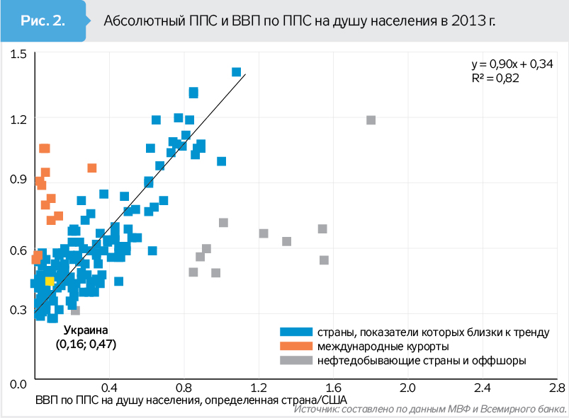 В случае расположения значений показателей выше определенного усредненного уровня, при прочих равных условиях, можно допускать наличие переоценки национальной валюты, в ином случае - ее недооценку. При анализе зависимости абсолютного ППС и ВВП по ППС на душу населения прослеживается отличие характера этой зависимости в
