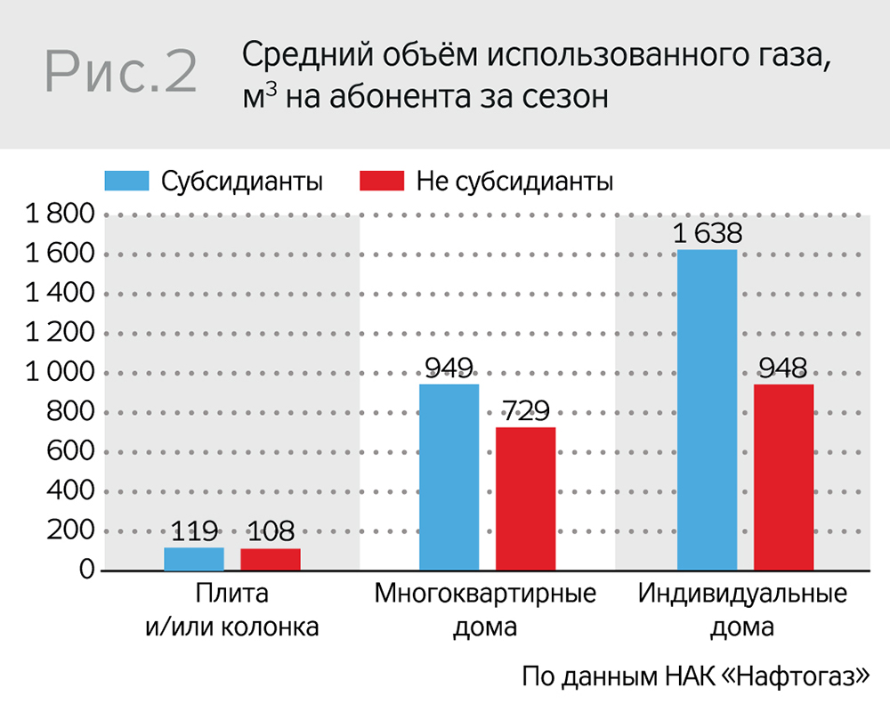 Согласно результатам анализа директора Фонда экологических инвестиций Алексея Хабатюка, система субсидий и льгот фактически снизила среднюю цену газа для населения в 2015 г. в 1,6 раза. Причем такое снижение произошло неравномерно между различными группами потребителей. Получатели субсидий практически не платили за потребленный газ собственными средствами, так как установленные государством социальные нормы, в пределах которых предоставляется субсидия, значительно превышают фактическое потребление. Это привело к демотивации субсидиантов к сокращению потребления газа, финансовой заинтересованности в такой экономии у них нет.