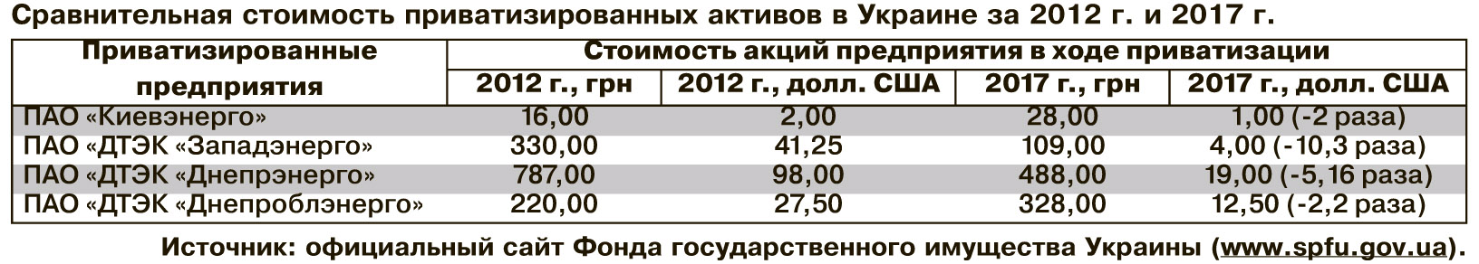 По состоянию на второе полугодие 2017 г. это касается ПАО "Киевэнерго", ПАО "ДТЭК "Западэнерго", ПАО "ДТЭК "Днепрэнерго", ПАО "ДТЭК "Днепроблэнерго". Ведь эти предприятия подлежали приватизации и были проданы по вышеописанной схеме в интересах одного владельца и по заниженной стоимости в 2012 г. Но стоимость указанных обществ в ходе приватизации 2017 г. была в 2–10,3 раза меньше (см. табл.). У украинского общества возникают вопросы: если предыдущая власть была "преступной", то эта власть, отвечающая за приватизацию, какая, "мегапреступная"?
