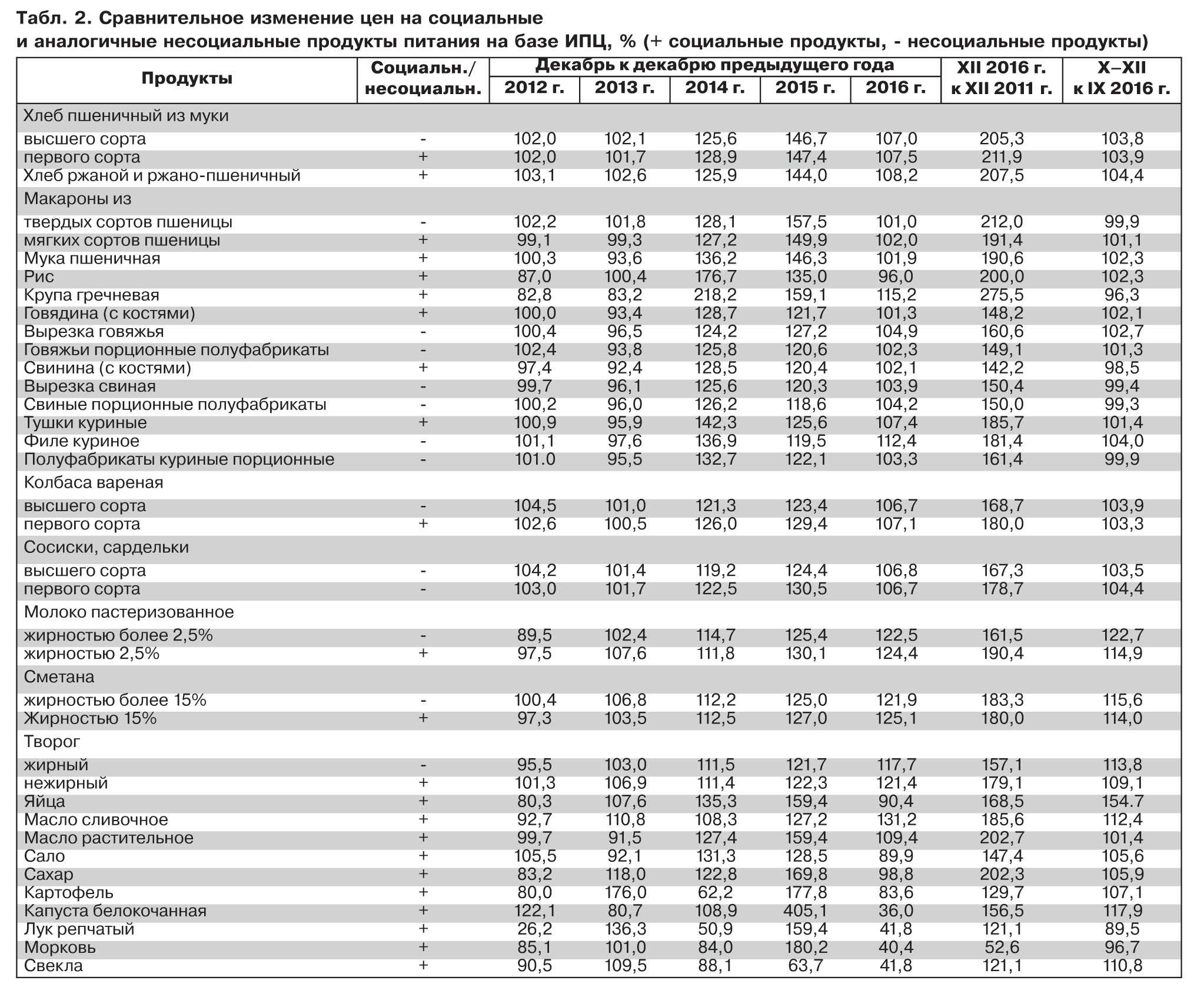 Расчеты за пятилетний период, базирующиеся на данных индексов потребительских цен (табл. 2), показывают, что по хлебу пшеничному, говядине, тушкам кур, колбасе вареной, сосискам и сарделькам, молоку пастеризованному и творогу цены по социальным продуктам росли быстрее, чем по их несоциальным аналогам. По макаронам, свинине и сметане наблюдалась аналогичная тенденция (хотя и в несколько меньшей степени). И это в некоторой мере объяснимо, так как при общем росте цен и низкой покупательной способности основной массы населения спрос перемещается на более дешевые продукты. А в рыночной экономике цены растут быстрее на продукты повышенного спроса.