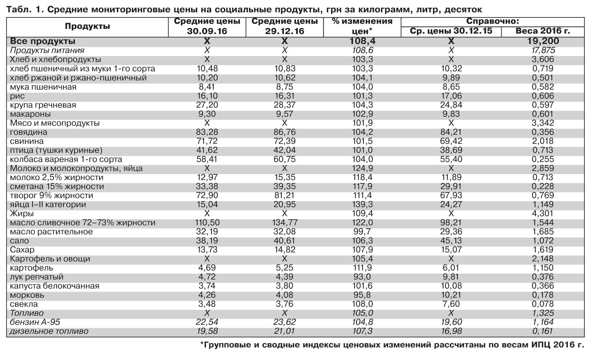 В табл. 1 приведены мониторинговые цены в среднем по Украине по всем социальным продуктам, а не только по предусмотренным кабминовским постановлением, с добавлением цен по ним на самый конец 2015 г. (т.е. фактически на начало 2016-го), а также для ориентации - их веса в 2016 г. в продуктовом наборе ИПЦ. А табл. 2 основана, как представляется, на более качественных и полных данных по тем же социальным продуктам питания за последние пять лет и заключительный квартал прошлого года.