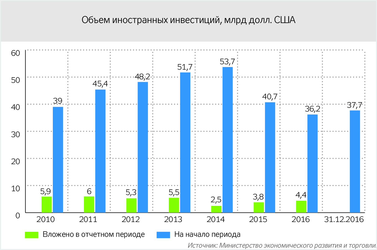 Это доказывает, что действующая программа реформ не принесла результатов в виде привлечения иностранных инвестиций. Хотя ПИИ в 2016-м и увеличились по сравнению с предыдущими двумя годами до 4,4 млрд долл., их львиную долю (64%) составляли взносы в капитал иностранных финансовых и страховых компаний, благодаря чему в прошлом году крупнейшим иностранным инвестором стала РФ (1,7 млрд долл.), опередив традиционного лидера - Кипр. Поэтому сегодня ключевым национальным приоритетом должно стать наращивание объемов инвестиций (иностранных и внутренних) в капитал.