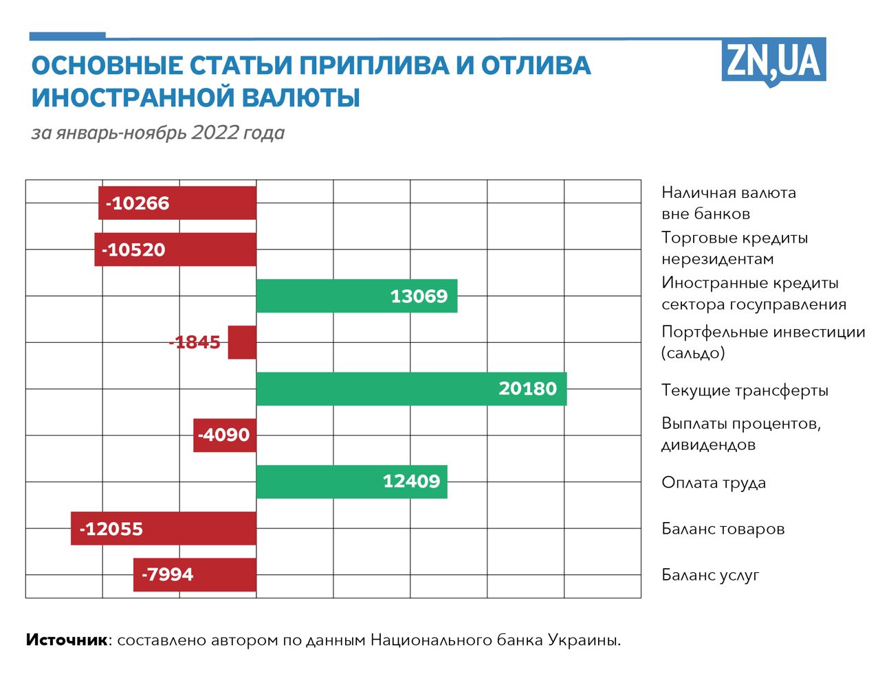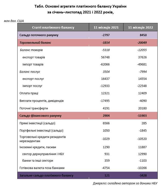 За январь—ноябрь 2022 года баланс текущего счета платежного баланса был положительным и достиг 8,5 млрд долл. США, в то время как за аналогичный период 2021-го имел место отрицательный баланс размером 2,8 млрд долл. Формирование профицита текущего счета было связано с увеличением текущих трансфертов за счет грантовой поддержки и гуманитарной помощи международных партнеров, а также с сокращением выплат дивидендов и процентов по кредитам. С другой стороны, дефицит торгового баланса увеличился с 1,8 млрд долл. до 20 млрд при драматическом сокращении как экспорта, так и импорта. При этом дефицит торговли товарами вырос более чем вдвое — до 12,1 млрд долл., а профицит торговли услугами сменился его дефицитом, достигнув 8 млрд долл. Основной причиной этого изменения стали траты украинских беженцев за границей в сумме 13,8 млрд долл. (которые отображались в составе импорта услуг).