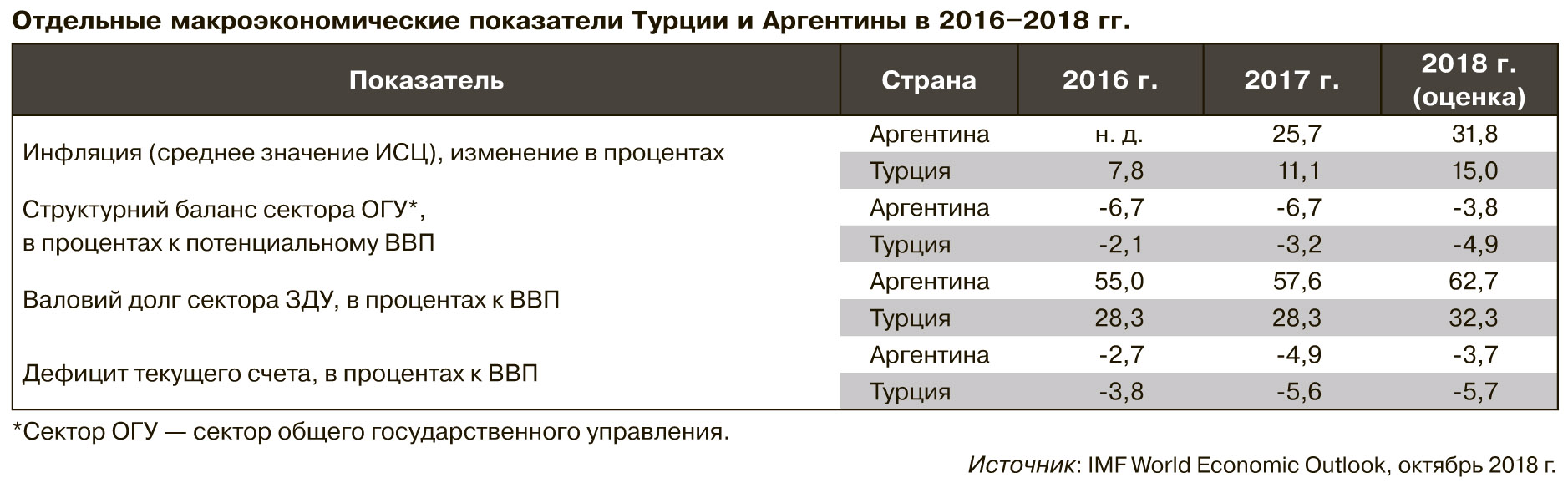 В обеих странах было существенное фискальное доминирование, а дефициты текущего счета вышли за приемлемые рамки, которые бы позволяли удерживать экономическую и финансовую стабильность в обеих экономиках (см. табл.). Так, дефицит текущего счета в Турции составлял 6,1% ВВП, в Аргентине - 4,5. Дефицит бюджета в Турции - 3,5% ВВП, в Аргентине - 5,6 (по состоянию на конец июня 2018 года, по оценкам журнала The Economist).