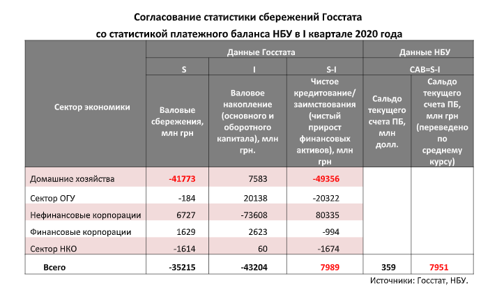 Посмотрим, как это выглядит на данных первого квартала 2020 года. Можем видеть, что в первом квартале 2020-го баланс «S-I», он же чистый прирост финансовых активов (Госстат), почти до копейки совпадает с данными НБУ по текущему счету платежного баланса и составляет 7989 млн грн. Его формирование обусловлено разницей между сбережениями институциональных секторов экономики и их инвестициями в нефинансовые активы.