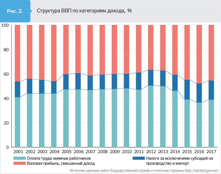 На протяжении 2000-х годов доля оплаты труда наемных работников поэтапно увеличивалась, превысив отметку 50% в 2012–2013 гг. (см. рис.2). Но с началом кризиса она стремительно сократилась до 36,6% в 2016 г., однако доля валовой прибыли, смешанного дохода выросла до рекордных 48%.