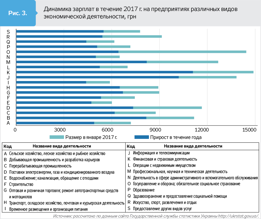В течение 2017 г. наибольший номинальный прирост зарплат наблюдался в следующих видах деятельности: государственное управление и оборона; обязательное социальное страхование (с 6420 грн в январе до 14442 грн в декабре, +8022 грн), профессиональная, научная и техническая деятельность (с 8195 до 12682 грн, +4488 грн), поставки электроэнергии, газа, пара и кондиционированного воздуха (с 7343 до 11654 грн, +4311 грн), финансовая и страховая деятельность (с 11092 до 14899 грн, +3806 грн), информация и телекоммуникации (с 10210 до 13833 грн, +3623 грн). Эти же виды деятельности показали наибольший прирост и в первом квартале 2018-го (за три месяца более 1000 грн).