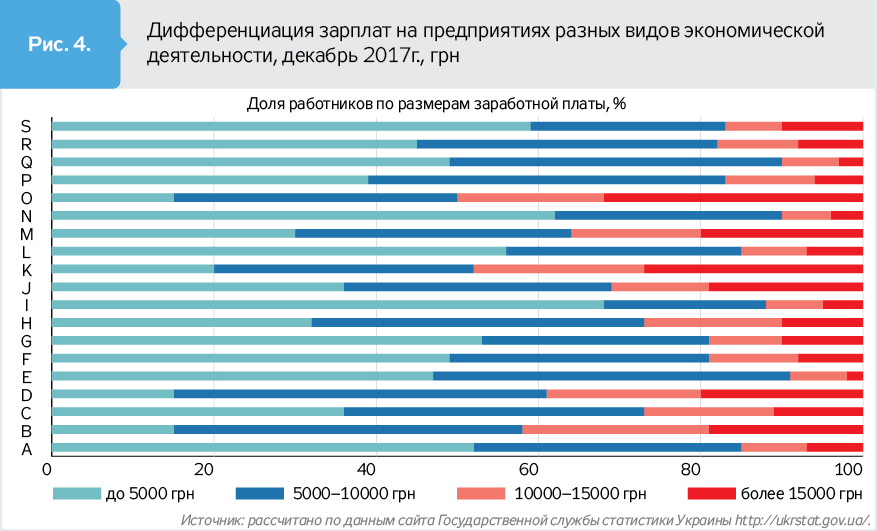 Причем внутри высокооплачиваемых секторов экономики неравенство между работниками по размерам зарплаты значительно выше (рис. 4). Собственно, дифференциация зарплат и формируется в основном благодаря высокооплачиваемым категориям, ведь нижняя граница регулируется размером минимальной зарплаты. В вышеназванных высокооплачиваемых видах деятельности доля работников с зарплатами свыше 15000 грн составляла в декабре 2017 г. около 20%, в финансовой и страховой деятельности - 26,7, в государственном управлении и обороне - 32%.