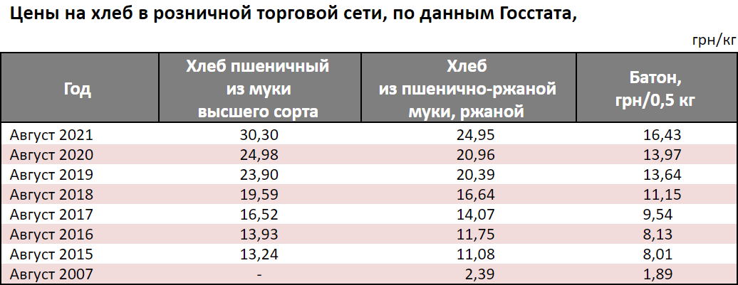 По данным «Укрхлебпром», в течение 2021 года хлеб уже подорожал на 10% (напомним, уровень инфляции по итогам 8 месяцев составляет 6,2%). По итогам августа, средняя цена в Украине за хлеб пшеничный из муки первого сорта составляет 23,91 грн/кг, хлеб ржаной и пшенично-ржаной — 24,95 грн/кг.