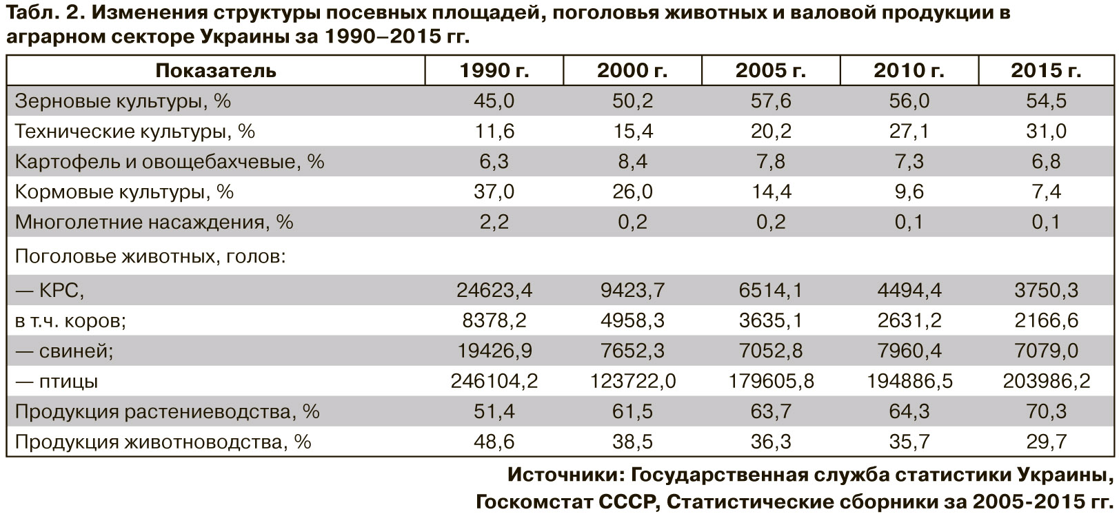 Следовательно, резкое сокращение количества занятых в аграрном секторе в течение 2010–2015 гг. другими причинами, кроме как ростом олигархических формирований, на мой взгляд, объяснить невозможно, поскольку они как раз интенсивно приумножились в последние годы, ведь темпы уменьшения занятости за этот период (13,2%) превышают уровень 2005–2010 гг. на 7,7 процентного пункта. Основная причина - переход агрохолдингов на монопроизводство двух самых механизированных культур - зерновых и масличных с одновременным уничтожением трудоемких отраслей - животноводства, овощеводства, садоводства, картофелеводства с присущим им низким уровнем рентабельности, что углубило внутриотраслевую пропасть дисбаланса как внутри растениеводства, так и между ним и животноводством (см. табл. 2).