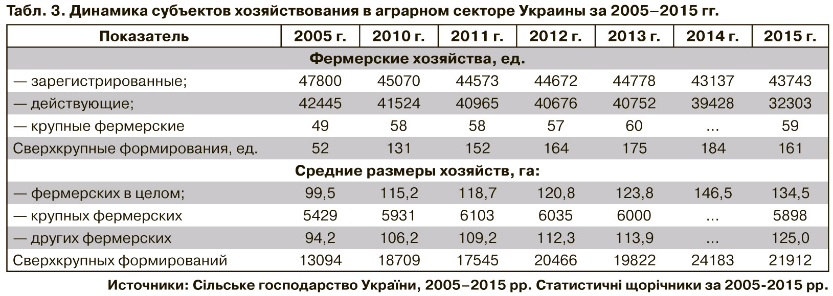 Совместно это вызвало обратную тенденцию процесса фермеризации, когда более четверти из зарегистрированных фермерских хозяйств не могут начать свою деятельность, а количество таких, которым удалось это осуществить, уменьшилось на более чем 10 тыс. Их же средние размеры (в 2015 г. - 125 га) по определению не позволяют применять современные средства производства, поскольку за этим средним показателем скрывается то, что 26,2% зарегистрированных фермерских хозяйств безземельные, а в трех четвертях действующих - до 50 га сельскохозяйственных угодий, в том числе почти у 11% земельные наделы меньше на порядок, поэтому такие хозяйства могут относиться к фермерским только формально, потому что мало чем отличаются от домохозяйств населения.