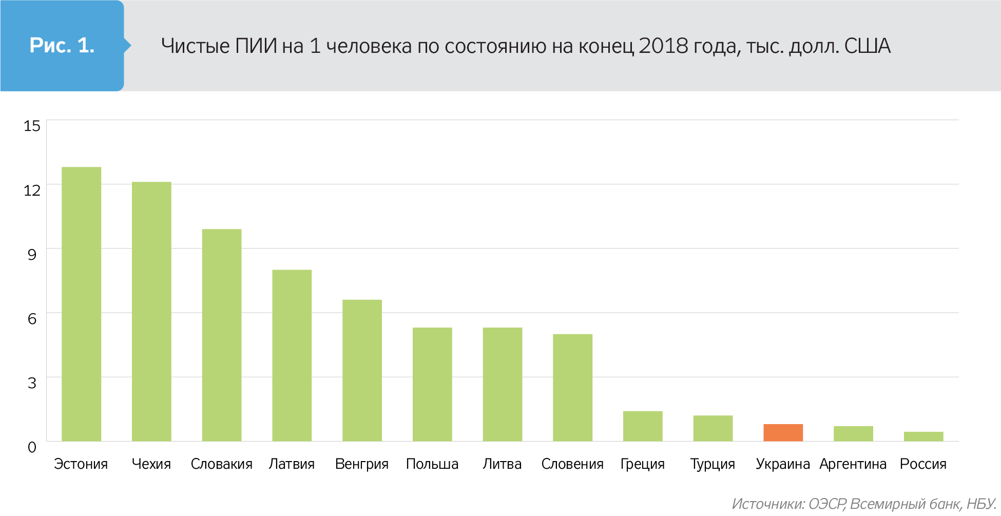 Приток прямых иностранных инвестиций в украинскую экономику по итогам 2019 года составит менее 2% ВВП, а их уровень на душу населения является одним из самых низких по сравнению с другими экономиками (рис. 1). Этого недостаточно для экономического роста на уровне 5–7% в год, к которому стремится правительство.