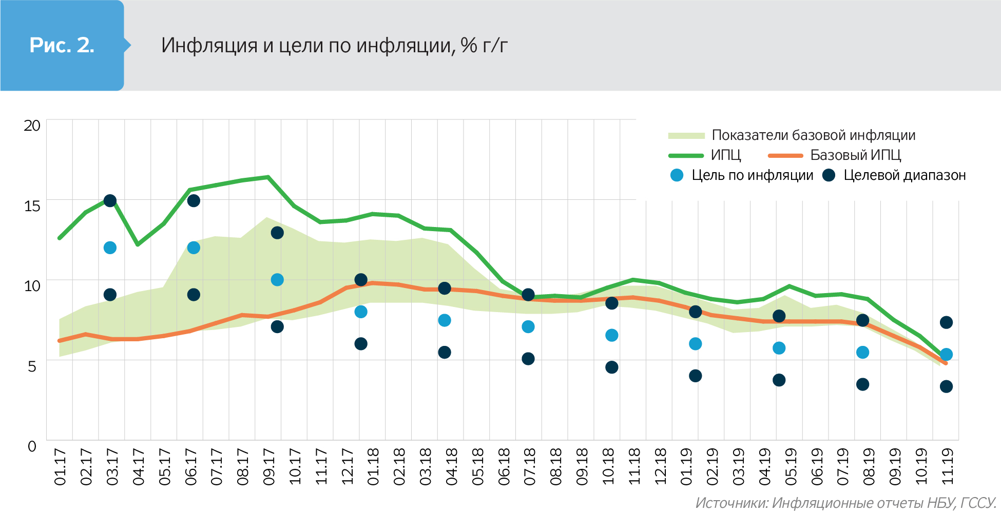 Де-юре, да и де-факто, монетарная политика НБУ по результатам 2019 года обеспечила достижение инфляционной цели - на конец ноября инфляция составляла 5,1% и с большой вероятностью по итогам года будет находиться в целевом коридоре (рис. 2).