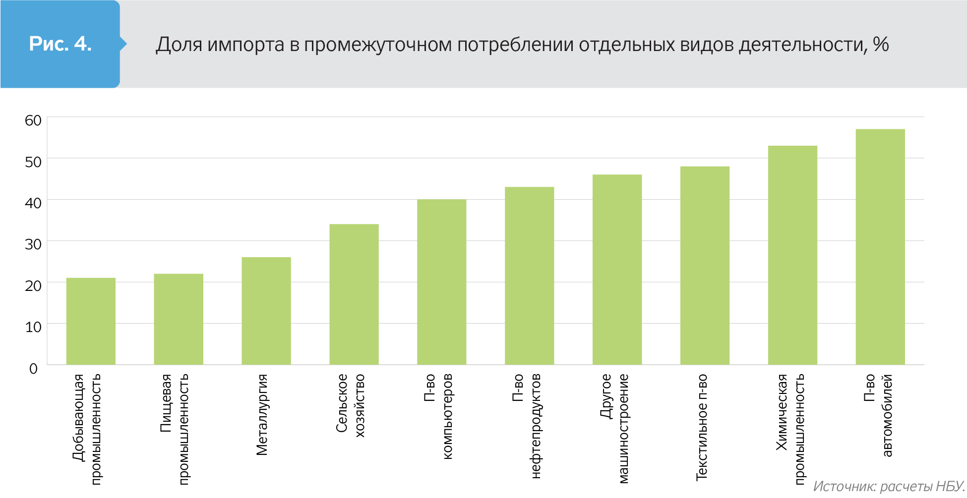 С другой стороны, в отдельных отраслях доля импорта в расходной части довольно высокая (рис. 4). Поэтому укрепление гривни снижает не только доход от экспорта в гривнях, но и расходы на импорт. И это в некоторой степени смягчало эффект влияния реального укрепления курса на доходы экспортеров.