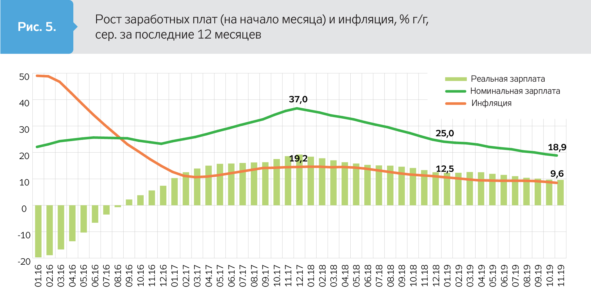 Снижение темпов инфляции положительно сказалось на росте высокими темпами реальных доходов населения. В частности, реальная заработная плата населения увеличивалась достаточно высокими темпами - на уровне 10% во второй половине 2019 года (рис. 5).