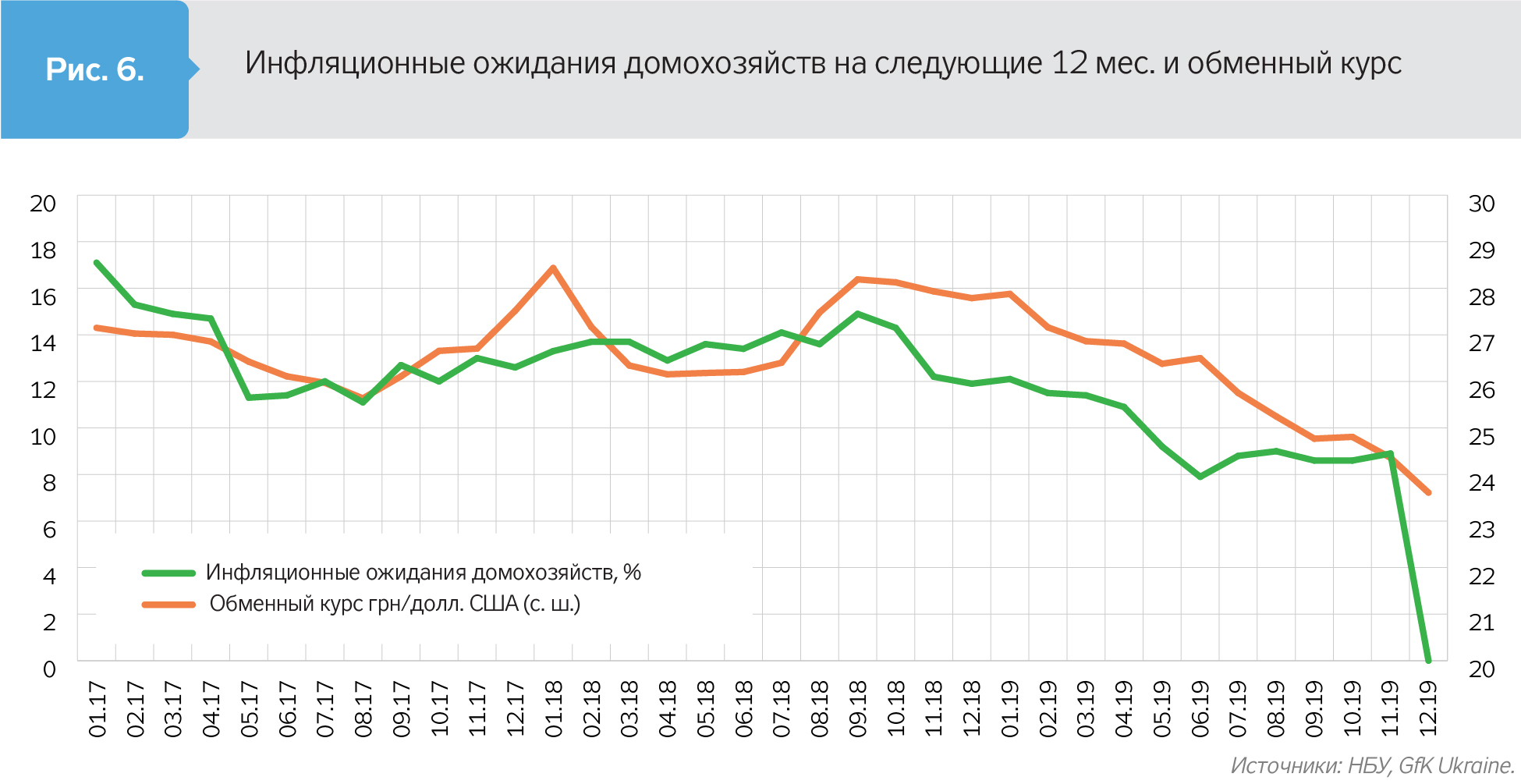 Инфляционные ожидания населения начали значительно снижаться с октября 2018 года (рис. 6). Существенное влияние на инфляционные ожидания оказывает не только процентная политика НБУ, но и текущая динамика обменного курса.