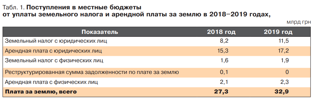 Земельные ресурсы являются значительным источником наполнения местных бюджетов, направляемых территориальными громадами на решение вопросов местного значения: благоустройство, жилищно-коммунальное хозяйство, образование, здравоохранение, социальные пособия. Общая сумма поступлений местных бюджетов от платы за землю составила в 2018 году 27,3 миллиарда гривен, а в 2019-м - 32,9 миллиарда (см. табл. 1). В общем объеме доходов местных бюджетов (без государственных субвенций и дотаций) на плату за землю приходится почти 11%.