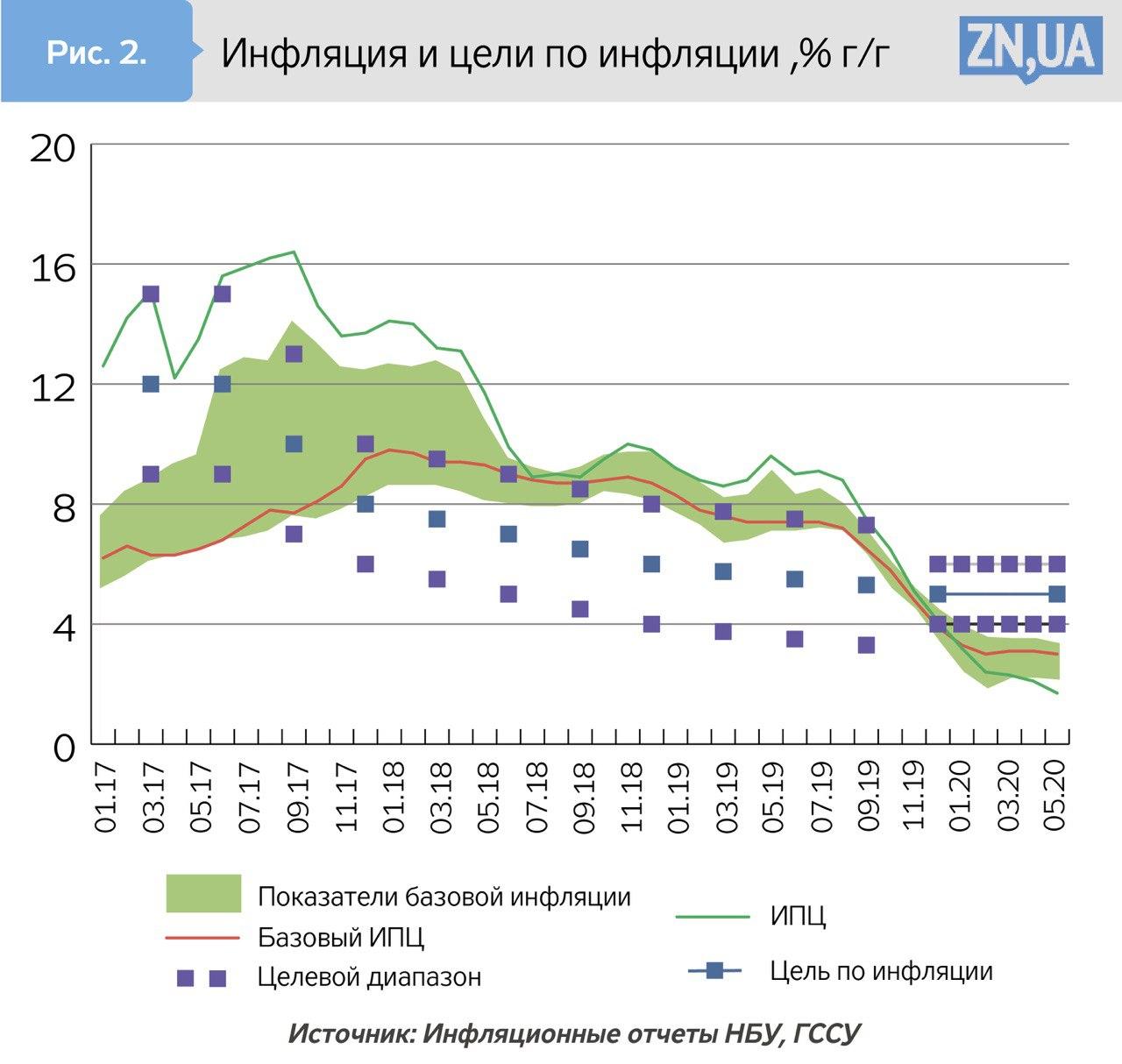 Во-первых, длительный цикл жесткой монетарной политики способствовал стремительному замедлению потребительской инфляции в конце 2019 года (до 4,1% г/г в декабре). Но дальнейшее замедление потребительской инфляции (до 1,7% г/г по итогам мая 2020-го) было существеннее, чем прогнозировал Национальный банк (см. рис. 2), и стало результатом запоздалой реакции денежно-кредитной политики на инфляционные процессы.