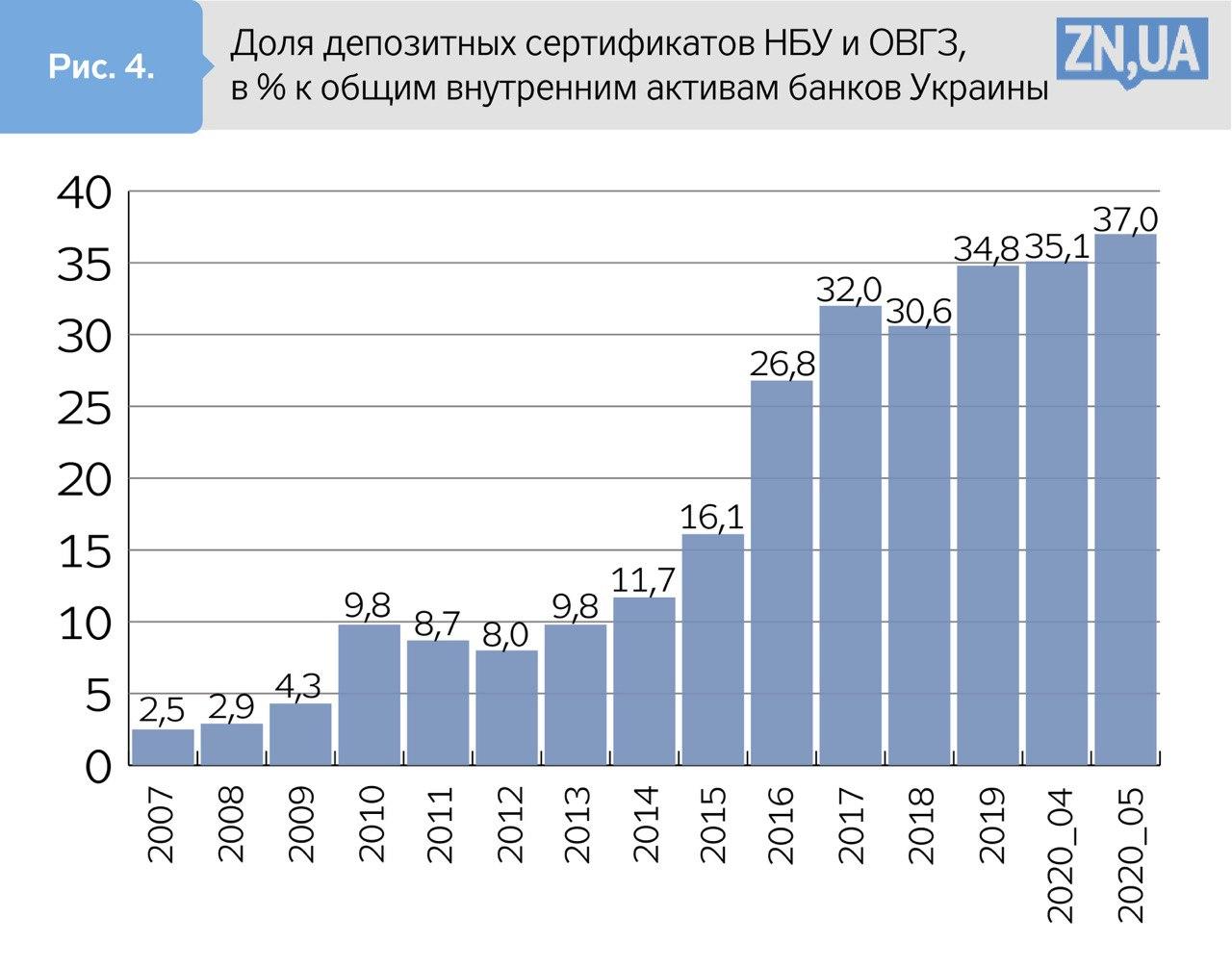 В-третьих, рынок банковского кредитования находится в состоянии стагнации, тогда как вложения банков в безрисковые инструменты достигли исторического максимума. За последние шесть лет чистое кредитование реального сектора и домохозяйств (без учета резервов под обесценивание кредитов) сократилось почти на треть, а вложения банков в депозитные сертификаты и государственные ценные бумаги выросли более чем в шесть раз! В результате уровень банковского кредитования экономики в Украине является самым низким в Восточной Европе (по работающим кредитам — 12% ВВП, для сравнения: в Польше — 56%, в Грузии — 63%), а доля безрисковых финансовых инструментов на конец мая 2020 года достигла 37% от внутренних активов банков (см. рис. 3, 4).