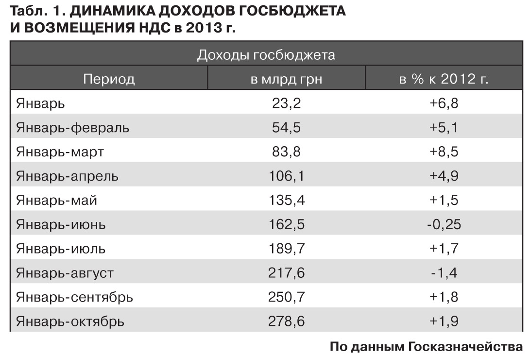 Правительству не хватает средств, хотя по итогам десяти месяцев доходы госказны по сравнению с аналогичным периодом 2012-го немного увеличились - на 1,9%. Проблема в том, что заложенная в госбюджете годовая "планка" роста поступлений - 6,9% (см.табл. 1 на 7-й стр.). Но в любом случае возникает вопрос: как бюджетные доходы могут увеличиваться на фоне нисходящей динамики экономики?