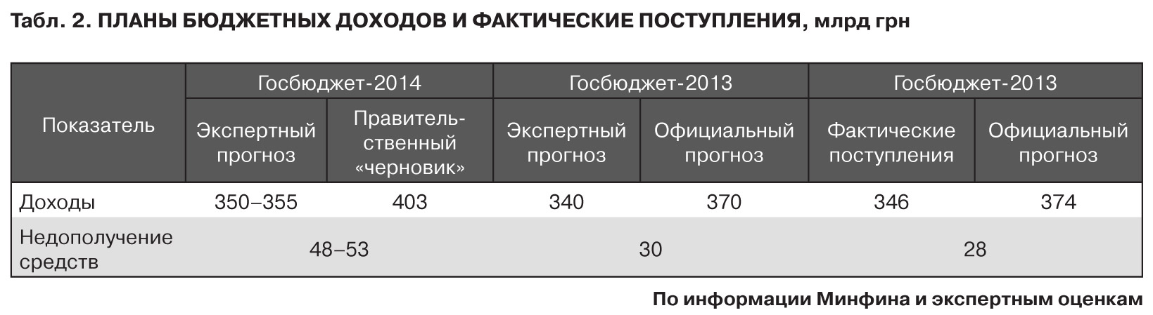 Как добавляет директор аналитической группы Da Vinci Анатолий Баронин, в процессе планирования лучше исходить из сдержанных прогнозов роста ВВП на 1,3–1,5% и инфляции 4–4,5% (больший уровень маловероятен с учетом того, что власть вряд ли допустит значительное ослабление гривни). "Доходная база госбюджета-2014 не должна превышать 350–355 млрд грн", - подчеркивает эксперт.