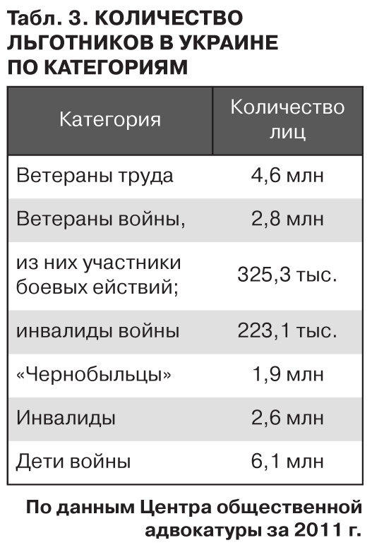 Для справки. По прошлогодним оценкам Минфина, соцльготы в Украине предусмотрены для приблизительно 18 млн граждан (табл. 3). Всего в государстве около 700 видов разных компенсаций, выплат и т.д. Как отмечали в Институте демографии и социальных исследований имени М.Птухи, в почти каждом втором украинском домохозяйстве есть человек, пользующийся, по крайней мере, одной льготой.