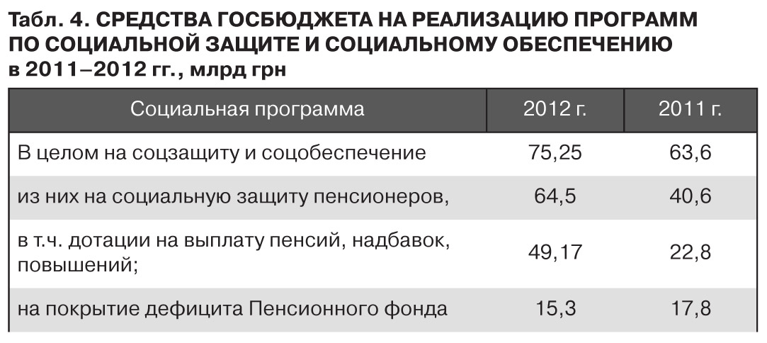Значительная часть средств прошлогоднего госбюджета пошла на реализацию программ по социальной защите и социальному обеспечению (табл. 4). На это было выделено 75,25 млрд грн, что больше, чем на образование, медицинскую сферу, охрану окружающей среды, ЖКХ и оборону, вместе взятые. В прош_лом году доля расходов на соцзащиту в госбюджете составляла 19% ( как и в 2011-м).