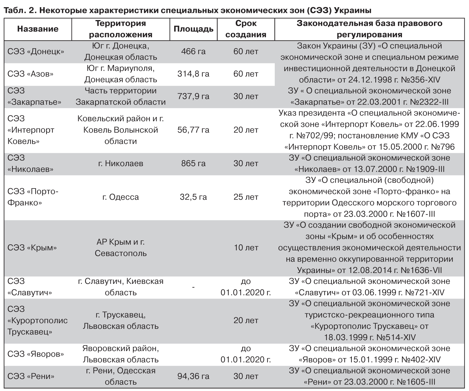 На сегодняшний день, по информации Министерства экономического развития и торговли Украины, насчитывается 11 специальных (свободных) экономических зон, созданных в конце 1990-х - начале 2000-х годов (см. табл. 2). Но сразу следует отметить, что льготный режим деятельности на территориях экономических зон отменен в 2005 г. и не восстановлен до сих пор. Поэтому предприятия, осуществляющие деятельность в их пределах, работают по общим правилам налогообложения и не имеют никаких государственных льгот и преференций. Собственно, этот инструмент инвестиционной политики - один из немногих реальных и эффективных в мировой практике - в Украине не используется. Это негативно сказывается на состоянии инвестиционного климата в стране, показателях деятельности отечественной промышленности и качества национального продукта.