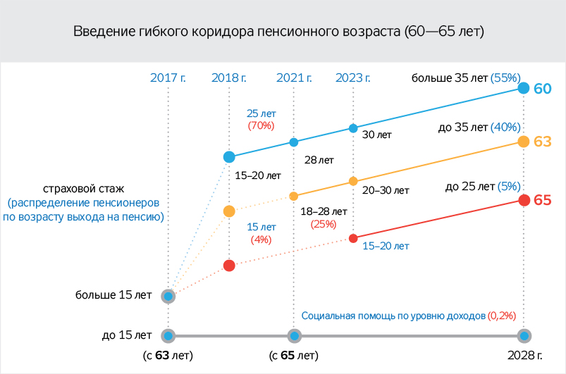Пенсия по возрасту в 60 лет будет назначаться при наличии страхового стажа 25 лет. Каждые 12 месяцев требование к размеру страхового стажа будет увеличиваться на год и к 2028 г., чтобы получить пенсию по возрасту, необходимо будет иметь 35 лет страхового стажа. В 63 года пенсия по возрасту как для мужчин, так и для женщин, будет назначаться при наличии страхового стажа продолжительностью от 15 до 25 лет. Каждые 12 месяцев требование к количеству страхового стажа будет увеличиваться на год до достижения в 2028 г. 25–35 лет страхового стажа. Начиная с 1 января 2019 г. лицам, у которых страховой стаж составит 15 лет, пенсия по возрасту будет назначаться в 65 лет.