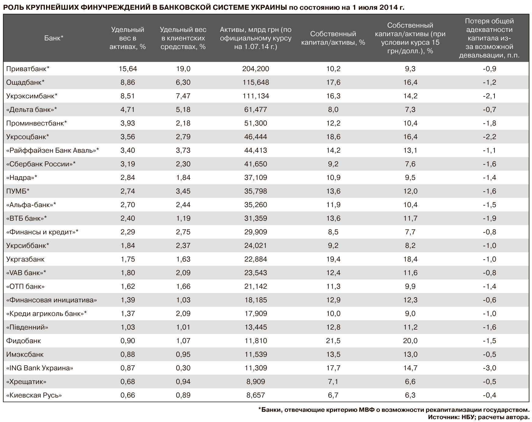 По состоянию на 1 июля таких банков было лишь 13 по активам (см. табл.). Сред них украинские государственные Ощадбанк и Укрэксимбанк; российские государственные Проминвестбанк, "Сбербанк России" и "ВТБ Банк", а также Укрсоцбанк, "Райффайзен Банк Аваль" и "Альфа-банк", принадлежащие иностранным финансово-банковским группам. Кроме них, частные Приватбанк Игоря Коломойского, "Дельта Банк" Николая Лагуна, "Надра" Дмитрия Фирташа, ПУМБ Рината Ахметова, "Финансы и кредит" Константина Жеваго. Исходя из размеров клиентских средств, к этой группе еще добавляются Укрсиббанк и "Креди Агриколь", принадлежащие французам, а также VAB Олега Бахматюка.