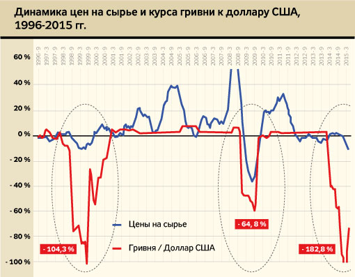 Беглого взгляда достаточно, чтобы понять: за последние 19 лет все (!) валютные кризисы в Украине происходили при падении мировых цен на сырье. Ее экономика и валюта не смогли противостоять ни одной (!) сырьевой рецессии. Причем обе держатся на ногах только (!) при росте экспортных цен. Малейший же сквозняк на сырьевых рынках отправляет их в реанимацию, требуя срочной вентиляции валютных резервов.