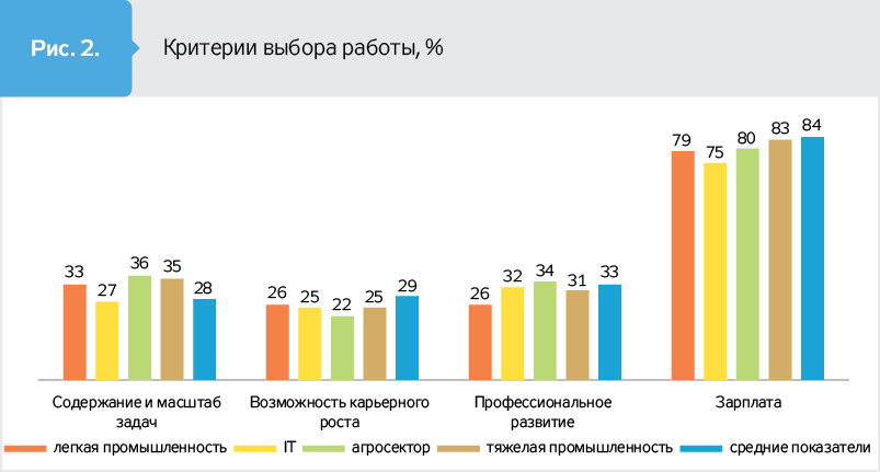 Так, ни у кого не вызывает сомнений тот факт, что размер заработной платы в целом является самым важным для всех участников опроса. Но в некоторой степени он менее ценен для респондентов, интересующихся работой в IT (см. рис. 2).Вспомним, что речь идет чаще всего о миллениалах. А согласно данным исследований Института Гэллапа, они работают не столько ради денег, сколько ради самореализации и великой цели.