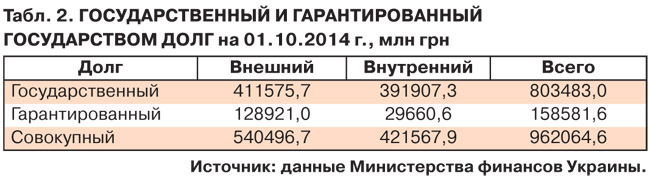 Госдолг тем временем уже достиг 64% ВВП, это свыше 50 тыс. грн на одного трудоспособного украинца. По данным Минфина на 1 октября с.г., совокупный украинский внешний долг уже перевалил за 41 млрд долл. По оценкам экономиста Алексея Молдована, только его обслуживание, с учетом нынешних темпов девальвации, потребует от Украины четверти ее госбюджета. С одной стороны, в условиях, когда инвесторы страну покинули и львиная доля капиталов правдами и неправдами была выведена из страны, кредиты МВФ - единственное, что позволило стране не обанкротиться. С другой - рост долговых обязательств создает давление на госфинансы и требует дополнительных источников их пополнения в бюджете 2015 г., проекта которого все еще нет. Как и изменений в Налоговый и Бюджетный кодексы, на которых он должен основываться.