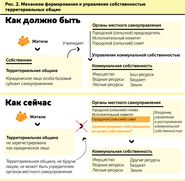 Фактически то ли была допущена грандиозная халатность, то ли совершено государственное преступление, когда вместо создания территориальных общин и юридического закрепления за ними прав собственности на землю, леса, водоемы и коммунальное имущество, права на объекты коммунальной собственности юридически закрепили за органами местного самоуправления. Поскольку общины не могли стать основателями органов местного самоуправления, ими в учредительных документах указаны физические лица, горисполкомы или даже... Закон Украины "О местном самоуправлении". Хотя согласно Конституции это могут быть исключительно территориальные общины.