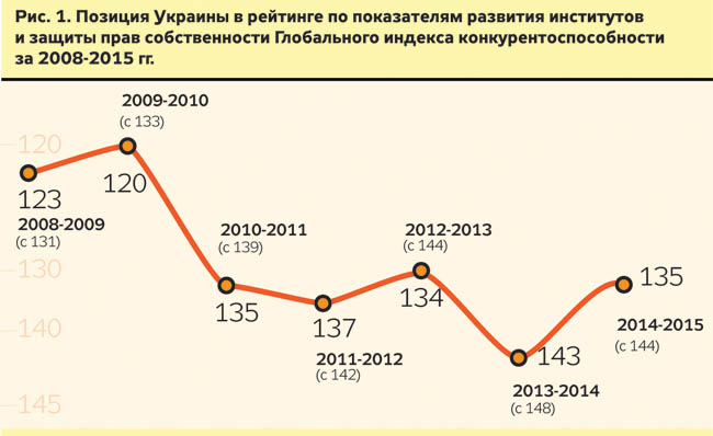 Интересовались ли вы, почему по индикатору "право собственности" Глобального индекса конкурентоспособности Украина входит в десятку стран, где это право в наименьшей степени защищено, и мы находимся на одном уровне по защите права собственности с Бурунди, Зимбабве, Чадом (рис. 1)?