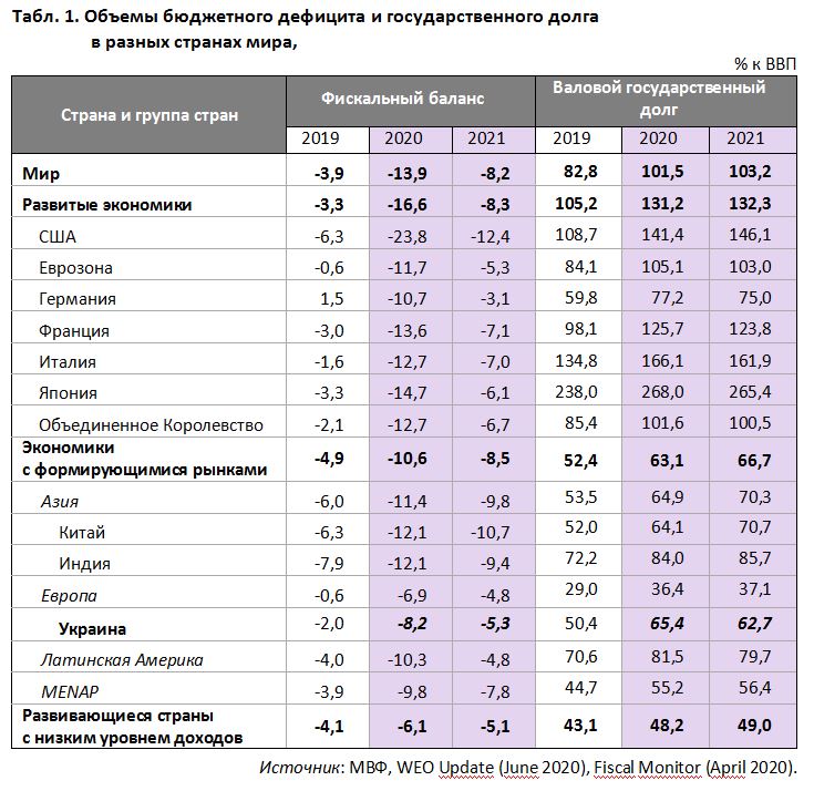 Согласно прогнозу МВФ, в 2020 году средний дефицит сектора общего государственного управления в мире вырастет до 13,9% ВВП, что на 10 п.п. превышает показатель предыдущего года (см. табл. 1). В Украине дефицит бюджета 2020 года ориентировочно составит 8,2% ВВП, отставая на 5,7 п.п. от среднемирового показателя.