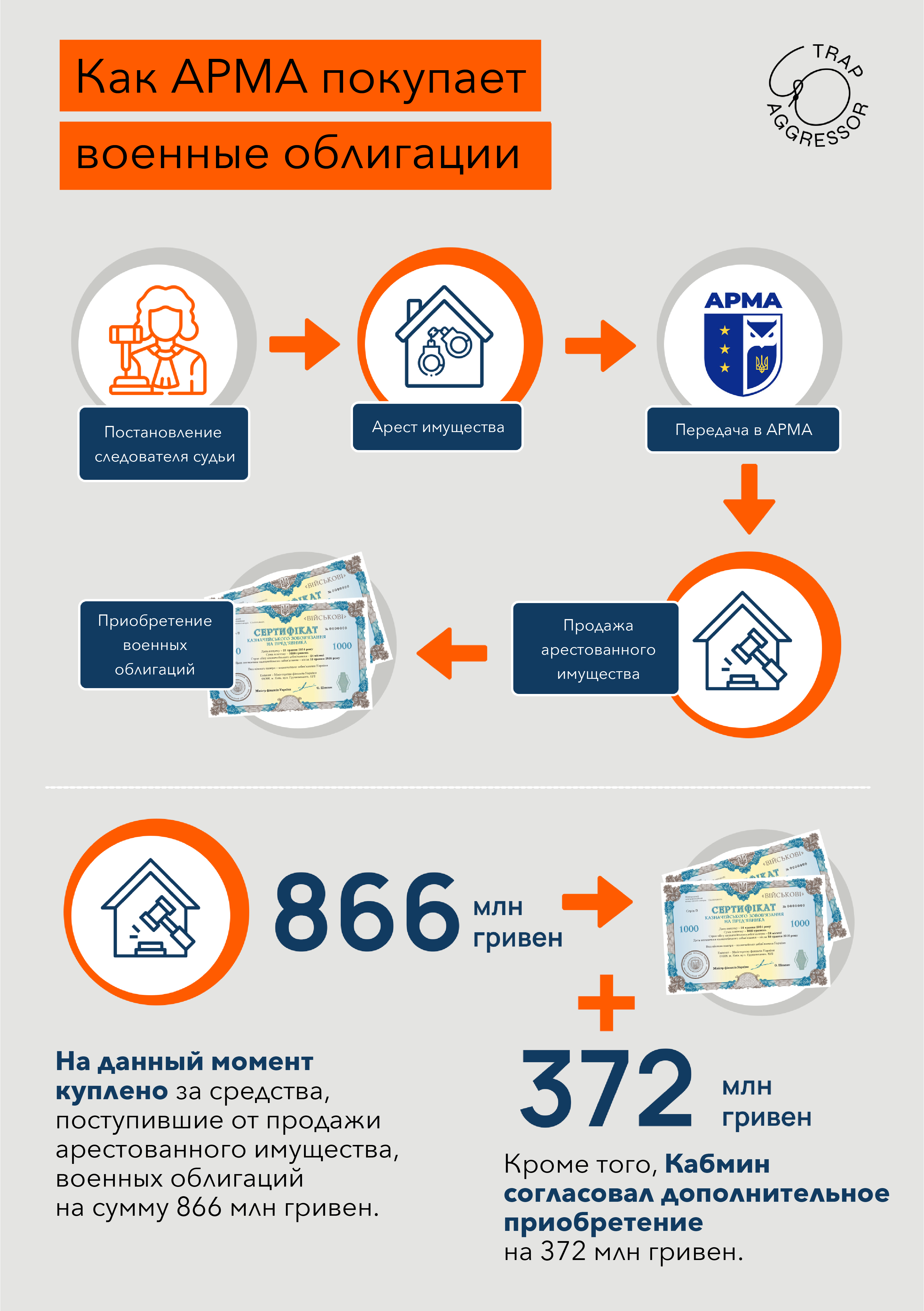 Соответственно, АРМА не предусматривает в своих бюджетах средств для компенсации «потерь» от покупки военных облигаций, которые нужно будет потом компенсировать путем продажи указанных ценных бумаг, поскольку лицо, у которого арестовали имущество и отменили потом эти ограничения, не хочет забирать облигациями. Или просто начнут «нагибать» владельцев имущества, правда, уже бывших, чтобы они успокоились и без проблем забрали хоть что-то.