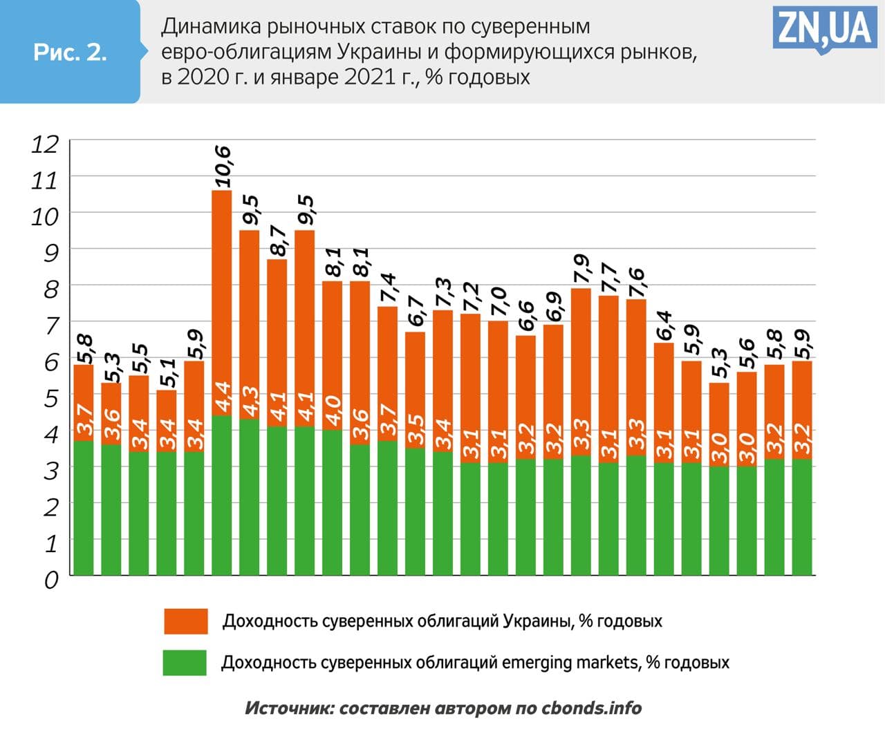 При снижении процентных ставок по долговым обязательствам большинства стран мира и падении доходности украинских еврооблигаций на международных рынках (см. рис. 2) рост доходности ОВГЗ с ноября 2020 года в некоторой степени отображал политическую составляющую — изменение вектора государственной политики по установлению доходности ОВГЗ. Вследствие таких изменений, а также роста объемов эмиссии ОВГЗ абсолютные расходы на обслуживание внутреннего долга в 2020-м остались на уровне предыдущего года (75,7 млрд грн), хотя средний уровень процентных ставок по ОВГЗ и снизился.