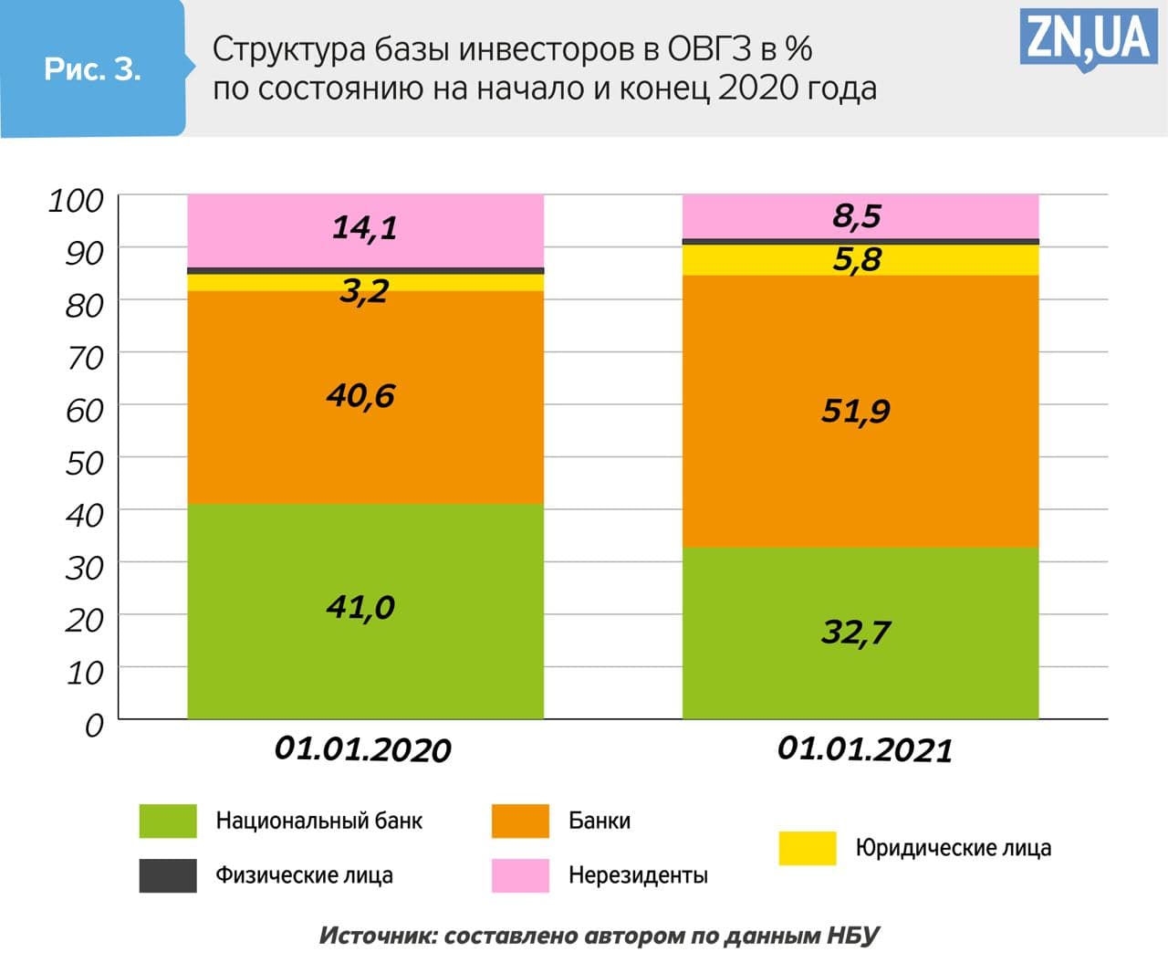 За 2020 год вложения физических лиц в ОВГЗ увеличились на 1,4 млрд грн, но составили всего 0,3% ВВП. В измерении международных сравнений подобный уровень участия физических лиц очень низкий. По данным Евростата, в Латвии и Литве приведенный показатель достигал 0,5% ВВП, в Польше — 1%, в Италии — 5,1%, в Ирландии — 6,8%, в Венгрии — 14,5%, в Португалии — 15% ВВП. В Украине такое положение объясняется высокими трансакционными расходами на приобретение ОВГЗ и сомнительными требованиями к инвесторам в части финансового мониторинга.