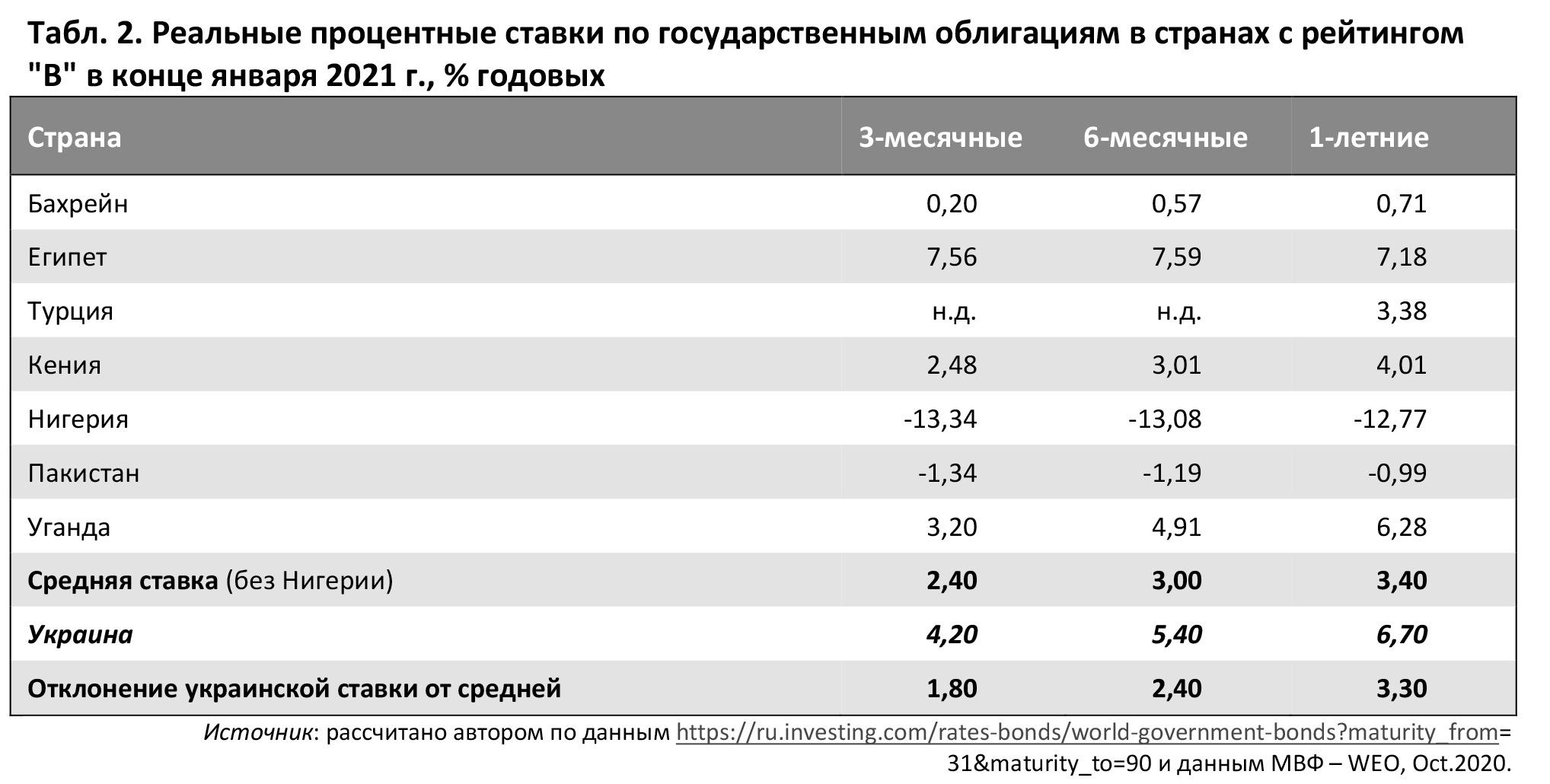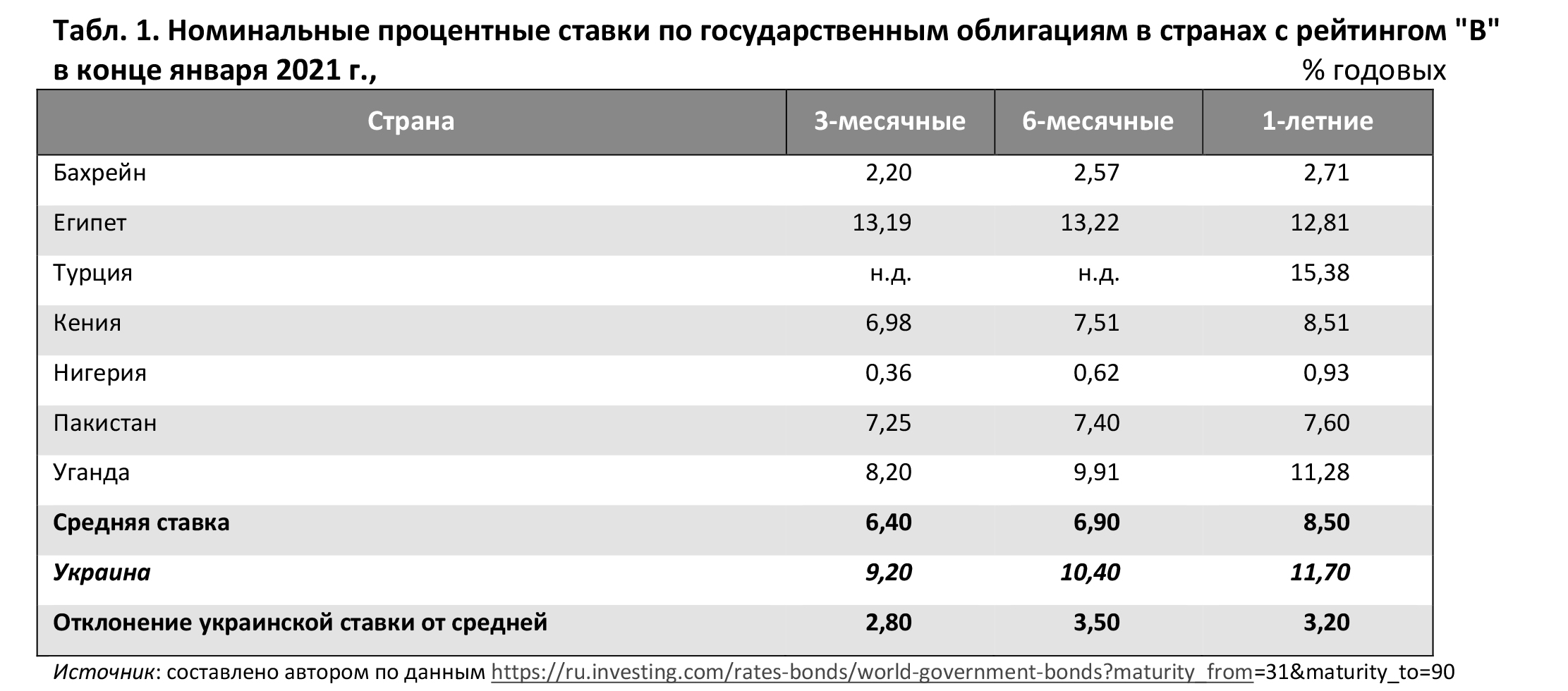 В международном контексте текущий уровень процентных ставок по ОВГЗ в Украине выглядит завышенным даже как для страны с низким кредитным рейтингом. Так, в январе 2021 года на первичных аукционах украинские ОВГЗ размещались по следующим номинальным ставкам: 9,2% годовых — 3-месячные облигации, 10,4% — 6-месячные, 11,7% — однолетние облигации.