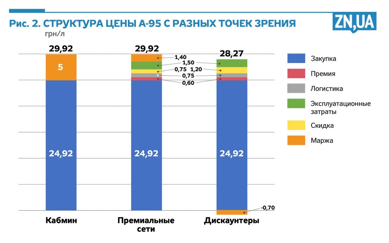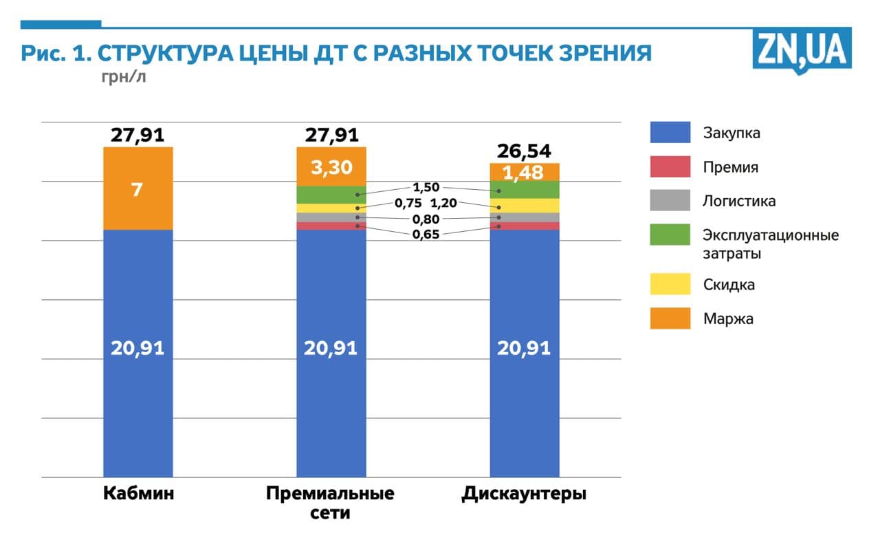 Но более интересная картина у дискаунтеров. Если всунуть в их цену «кабминовскую» закупочную цену и остальные понятные параметры, то получим, что продажа каждого литра бензина приносит им 70 коп. убытка, дизтоплива — 1,5 грн/л прибыли. Здесь следует также внести ясность: подразумевается, что речь идет о продаже заводского продукта с выдачей честного фискального чека. И вот в этом вся соль.