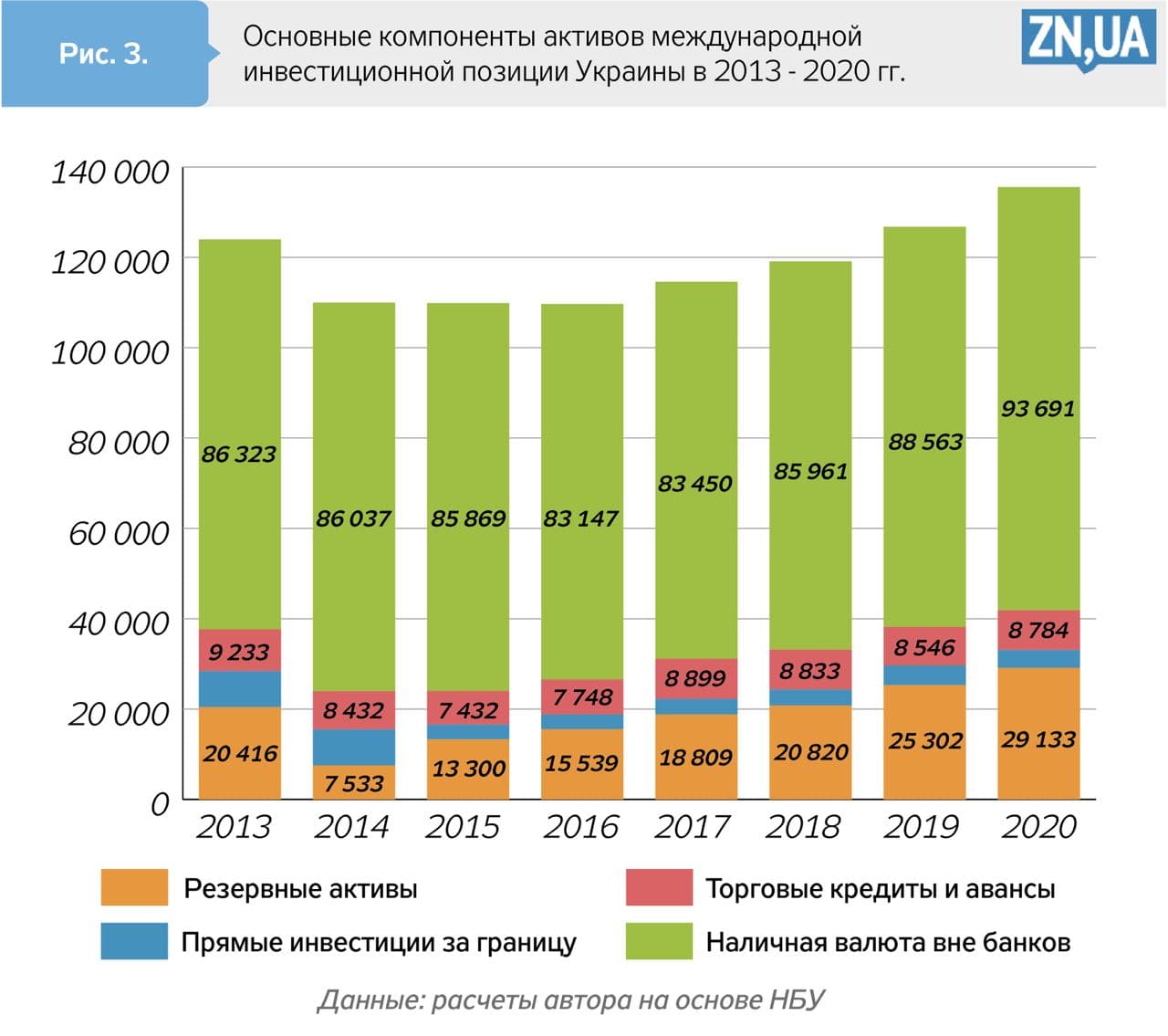 Прирост внешних активов за 2020 год почти отвечал показателю 2019-го. Но если анализировать структуру прироста активов в динамике, то в 2020 году в несколько раз уменьшились прямые и портфельные инвестиции резидентов Украины, тогда как объем наличной валюты вне банков увеличился вдвое. Накопление наличной валюты ускорилось в связи с усилением экономической неопределенности во время кризиса, всплеском девальвационных процессов, а также сокращением финансирования теневых операций в условиях перманентных карантинных ограничений.
