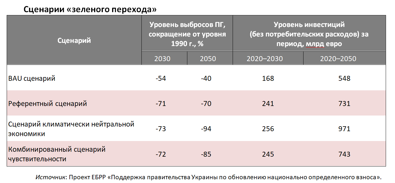 — при сценарии климатически нейтральной экономики (отвечает сценарию Международного энергетического агентства, МЕА, и Межправительственной группы экспертов по изменению климата, МГЭИК (IPCC), и определяет цель иметь в 2050 году не более 1,7 тонны СО2 на душу населения, а к 2070 году — достичь в Украине нетто-нулевых выбросов ПГ) выбросы в 2030 году должны сократиться на 73%, то есть до 238 млн тонн. При этом требуемый уровень инвестиций за 2020–2030 годы — 256 млрд евро, а за 2020–2050 годы — 971 млрд;